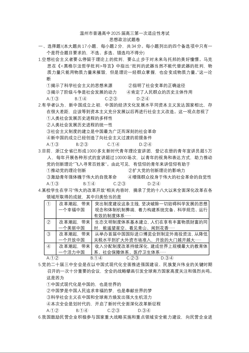浙江省温州市高中2025届高三上学期第一次模拟考试政治+答案