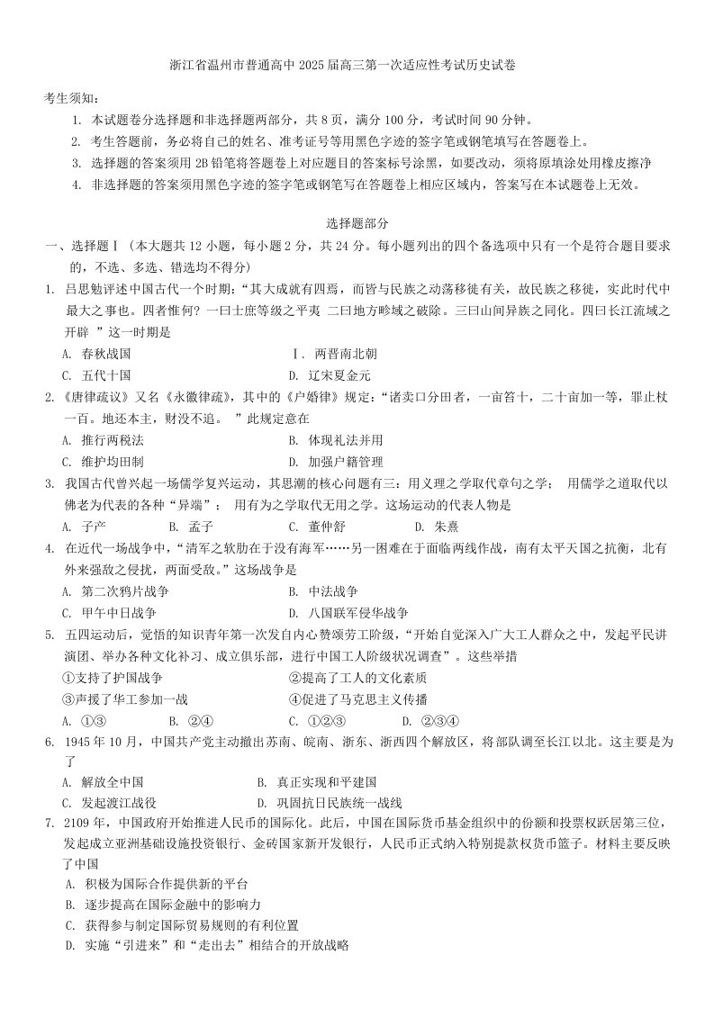 浙江省温州市高中2025届高三上学期第一次模拟考试历史+答案