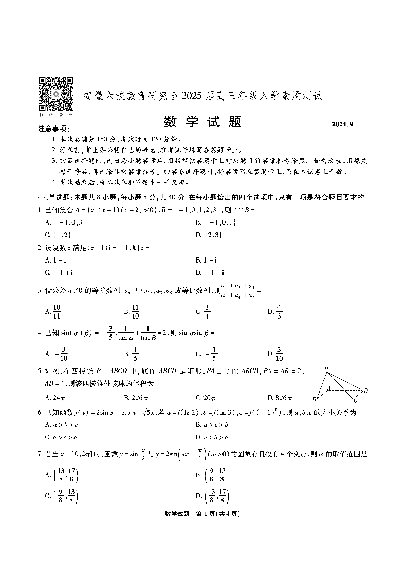 安徽省安徽六校教育研究会2025届高三年级入学素质测试数学试题
