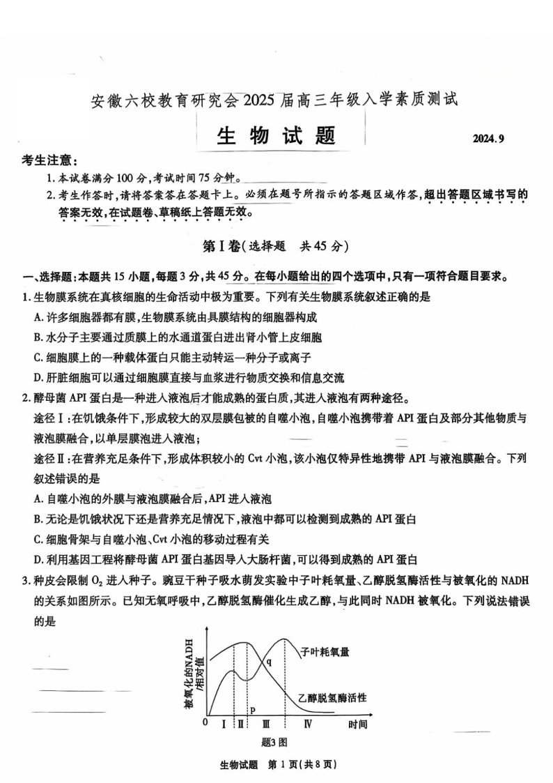 安徽省安徽六校教育研究会2025届高三年级入学素质测试生物+答案