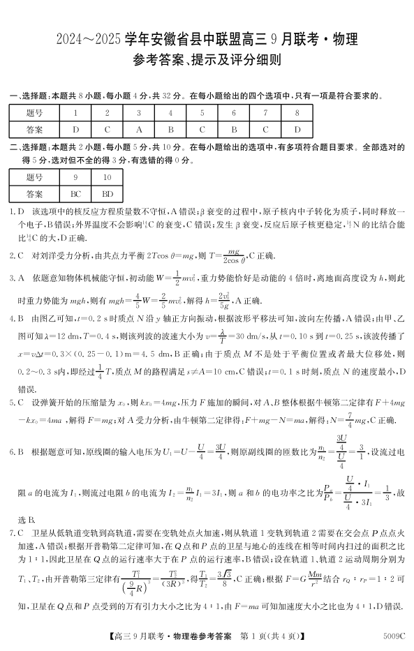 安徽县中联盟2024-2025学年高三9月联考物理答案
