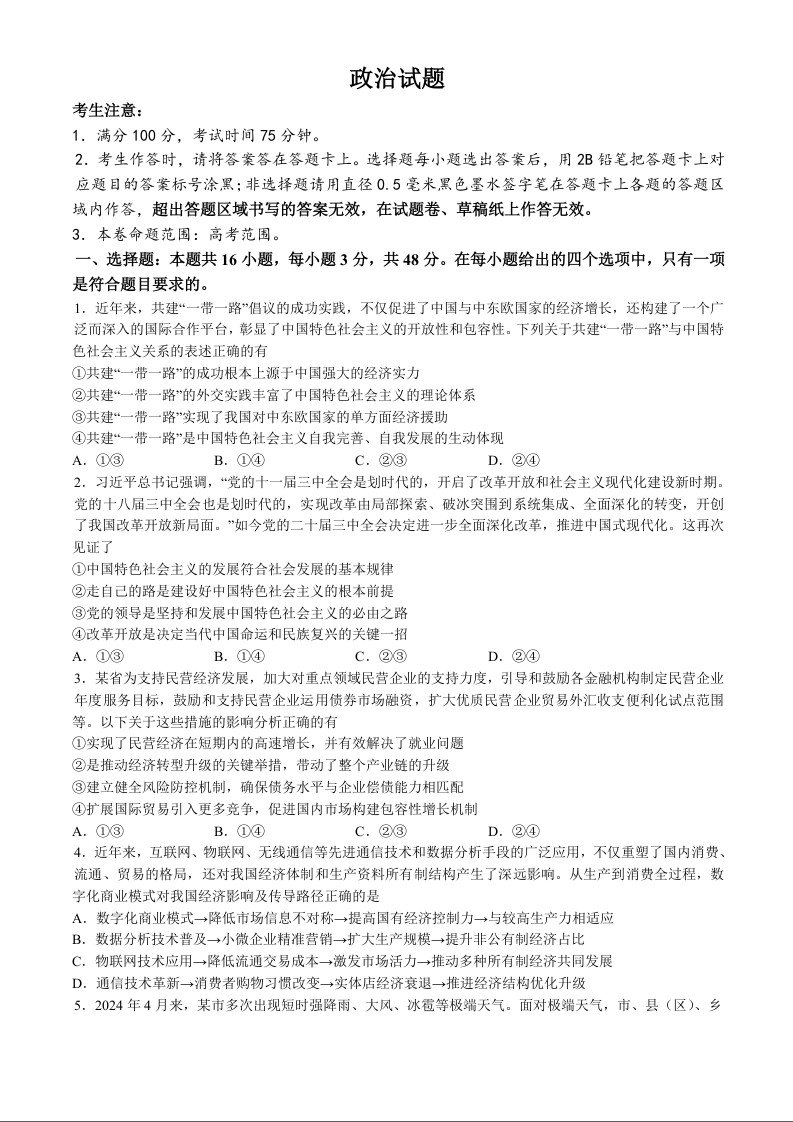 安徽县中联盟2024-2025学年高三9月联考政治试题