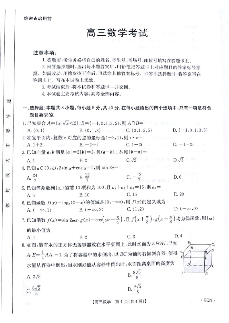 甘肃青海宁夏部分学校2025届高三9月开学大联考数学+答案