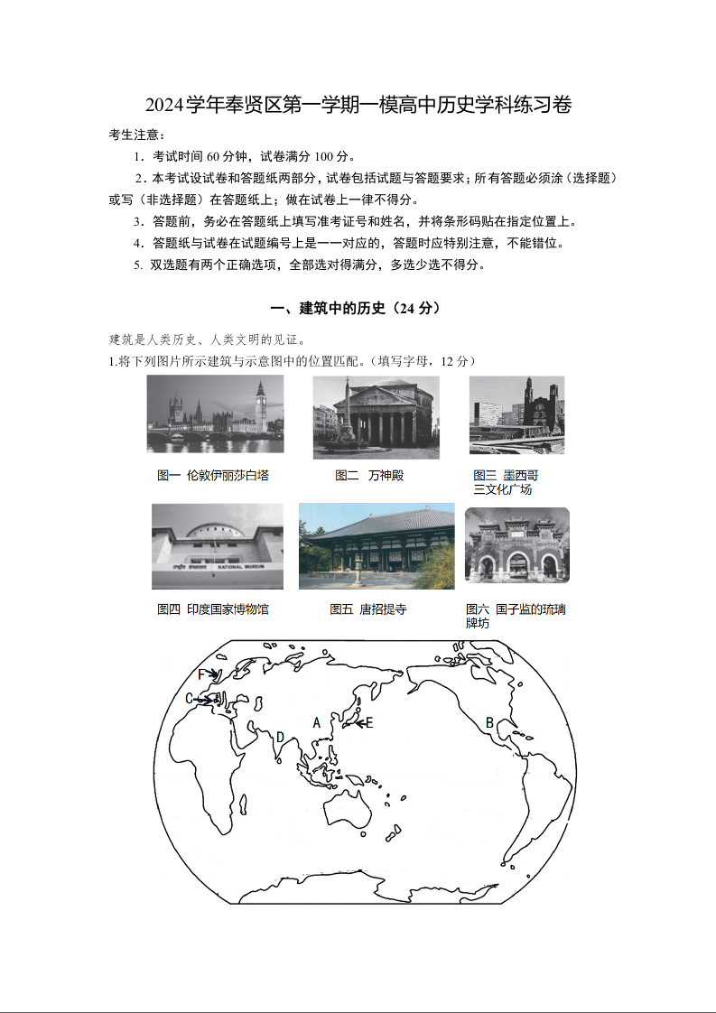 上海市奉贤区2025届高三上学期一模历史+答案
