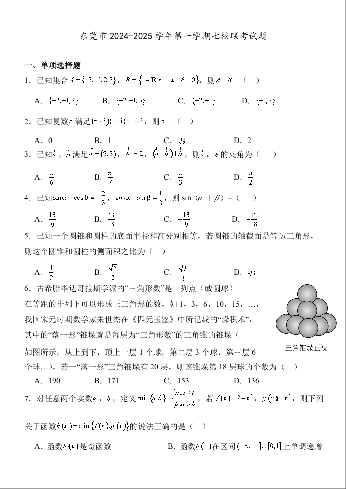 广东省东莞市七校联考2025届高三上学期12月月考数学