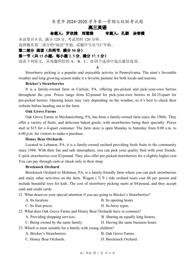 广东省东莞市七校联考2025届高三上学期12月月考英语