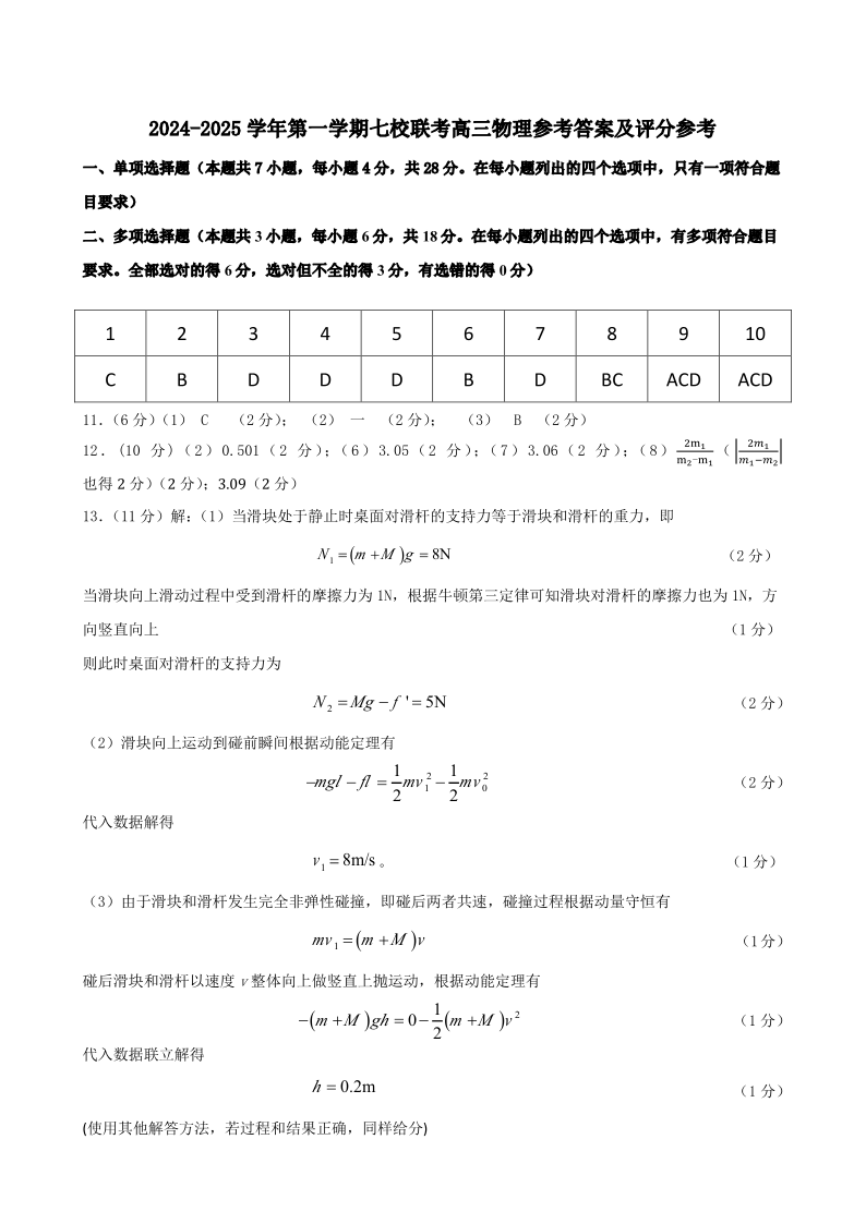 广东省东莞市七校联考2025届高三上学期12月月考物理答案