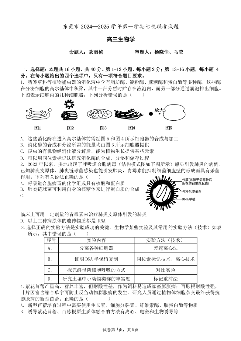 广东省东莞市七校联考2025届高三上学期12月月考生物