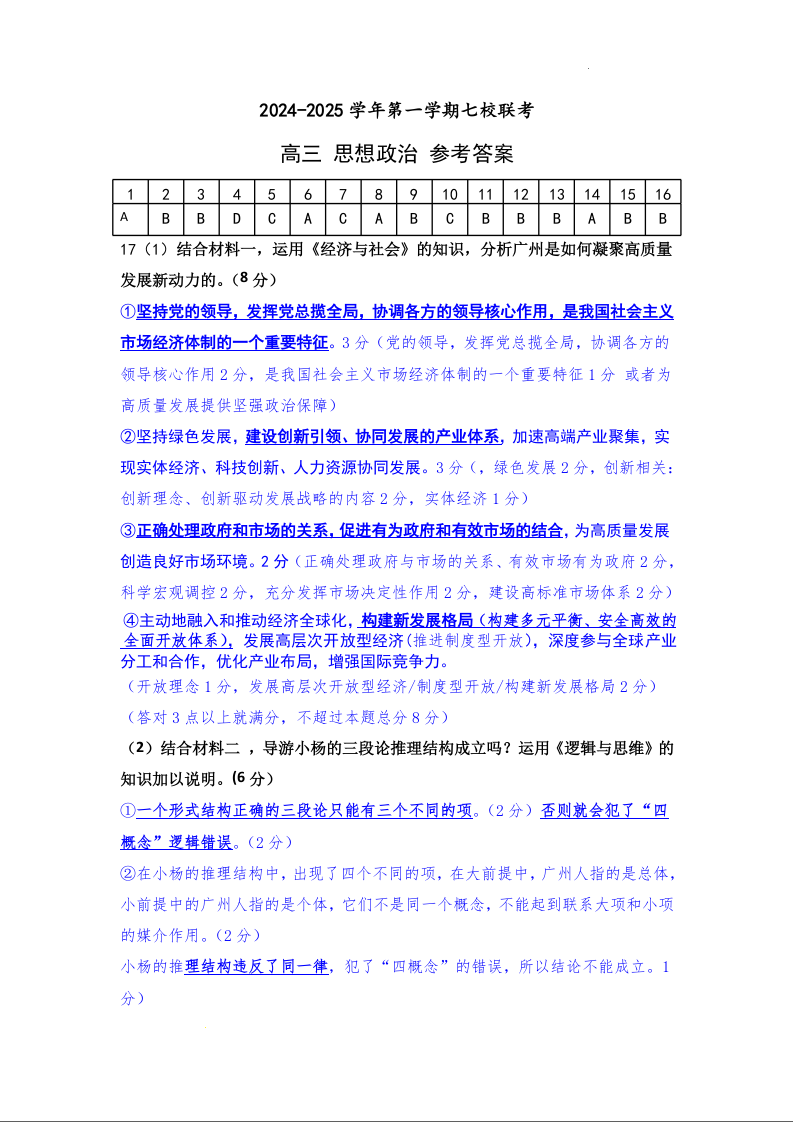 广东省东莞市七校联考2025届高三上学期12月月考政治答案