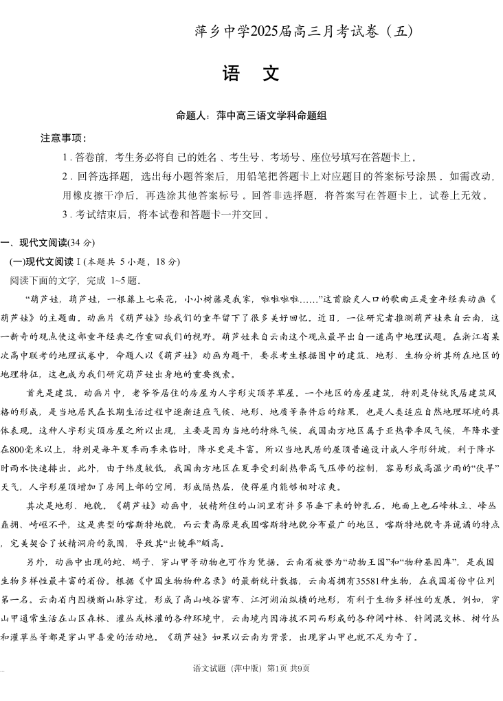 江西省萍乡市萍乡实验2025届高三上学期月考卷(五)语文
