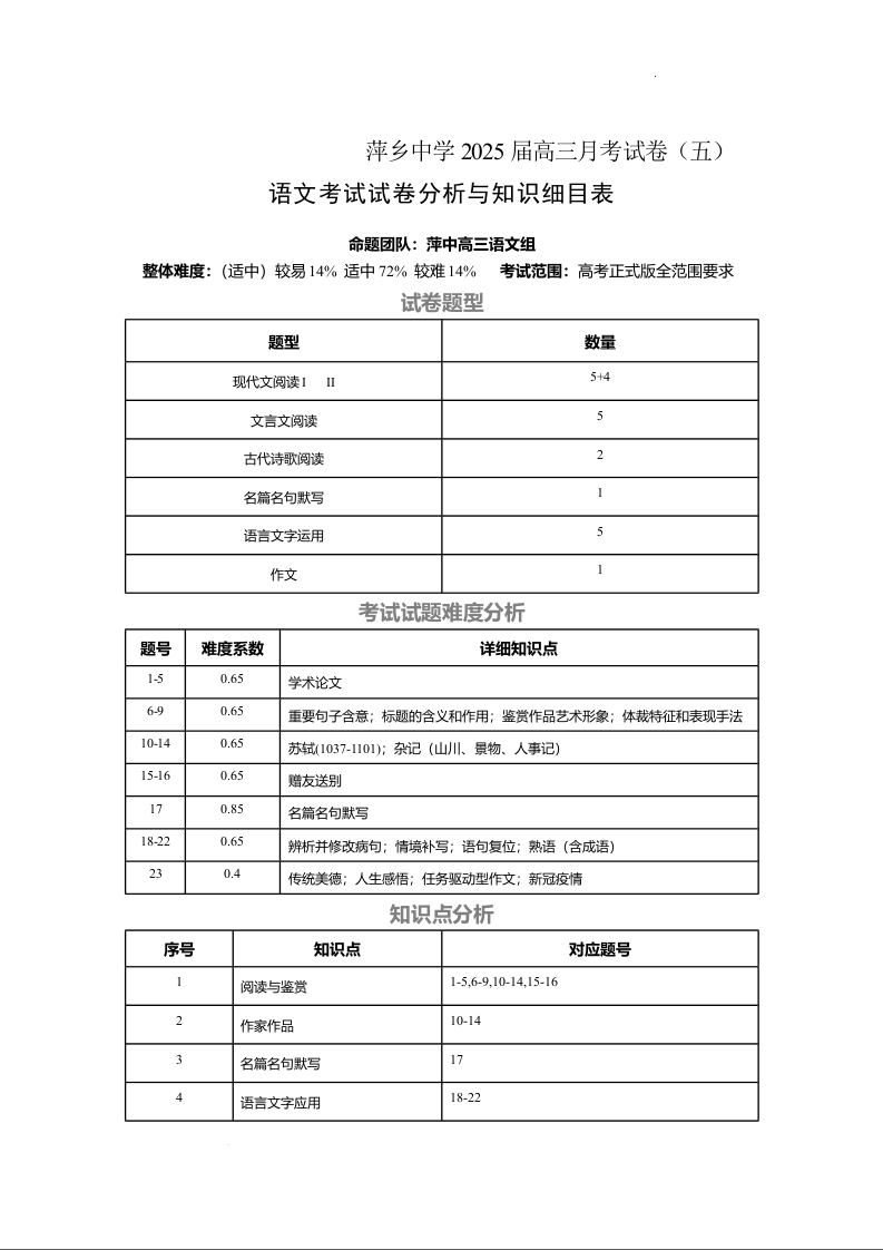 江西省萍乡市萍乡实验2025届高三上学期月考卷(五)语文细目表