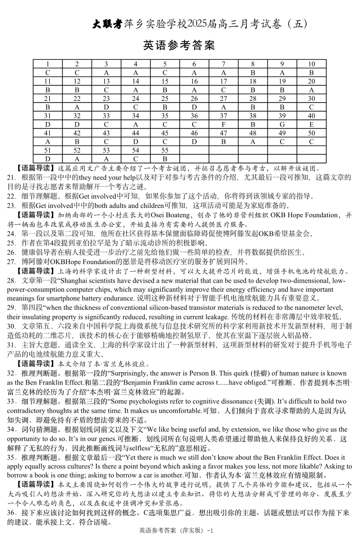 江西省萍乡市萍乡实验2025届高三上学期月考卷(五)英语答案