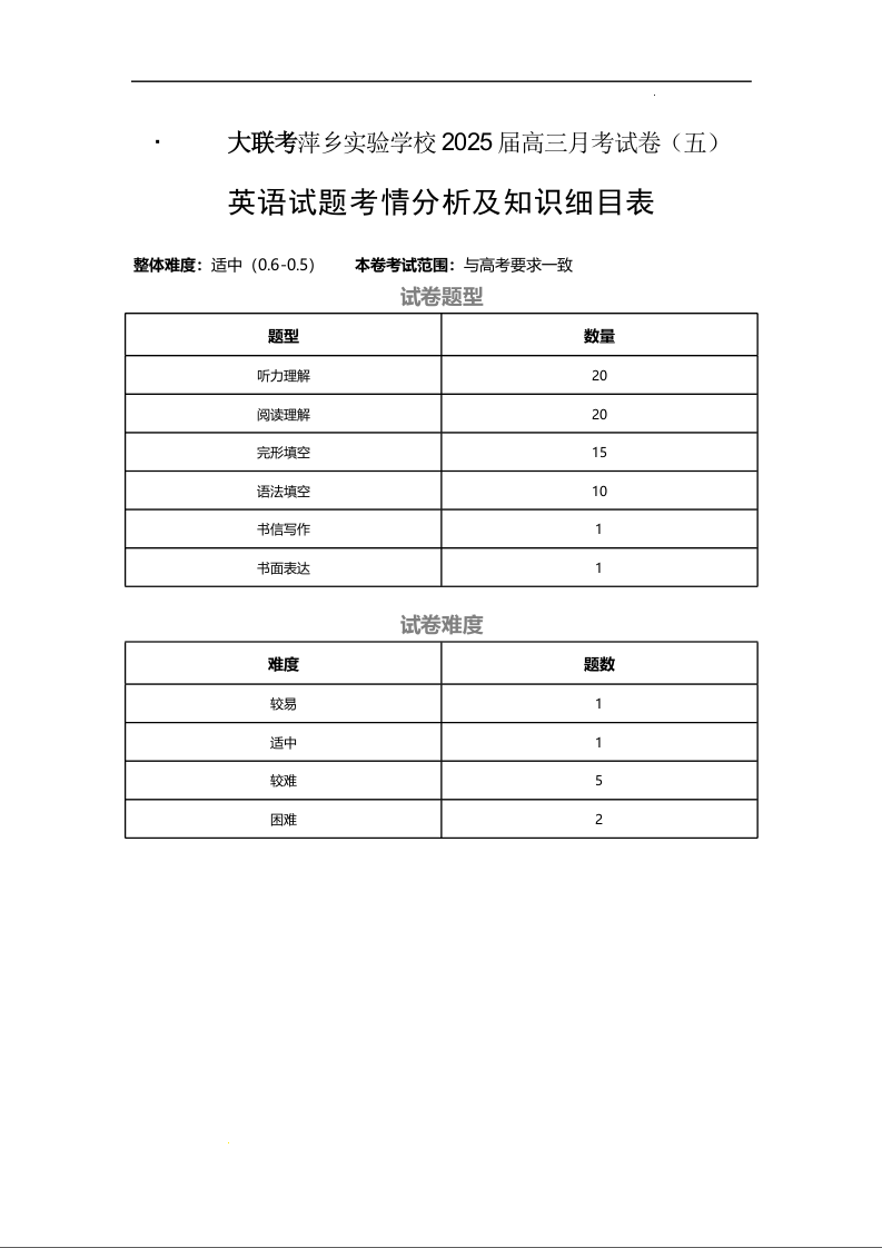 江西省萍乡市萍乡实验2025届高三上学期月考卷(五)英语细目表