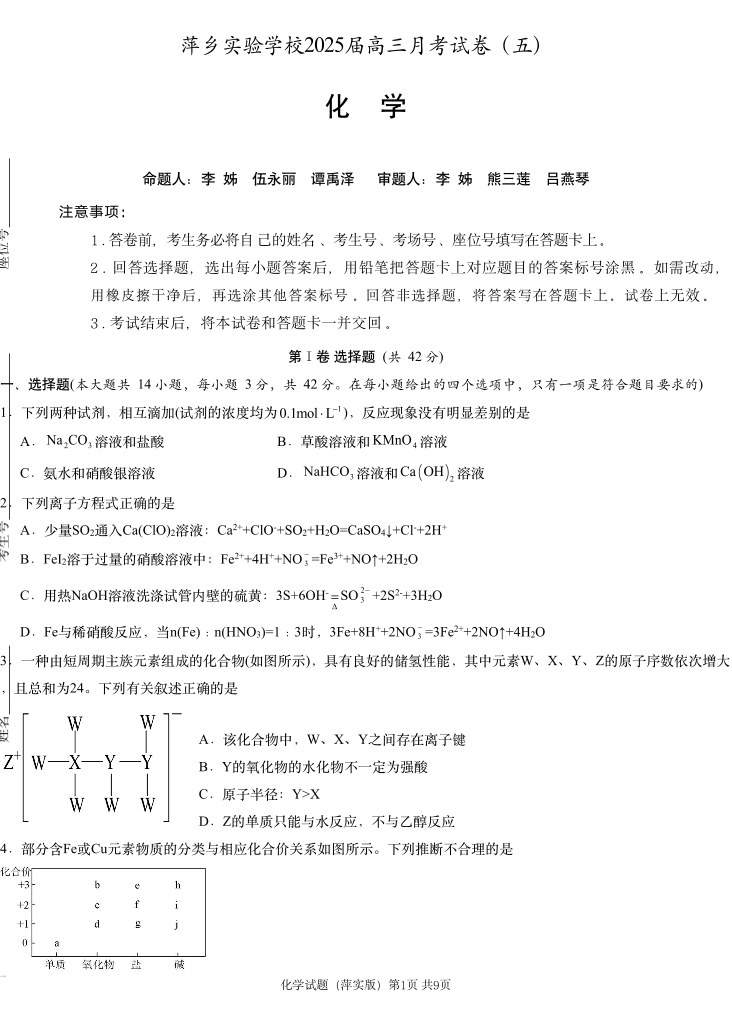 江西省萍乡市萍乡实验2025届高三上学期月考卷(五)化学