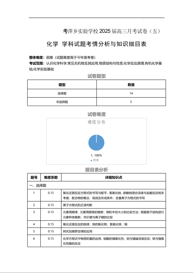 江西省萍乡市萍乡实验2025届高三上学期月考卷(五)化学细目表