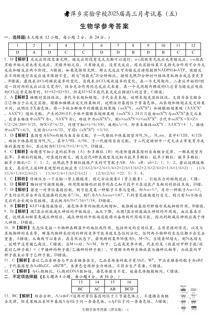 江西省萍乡市萍乡实验2025届高三上学期月考卷(五)生物答案