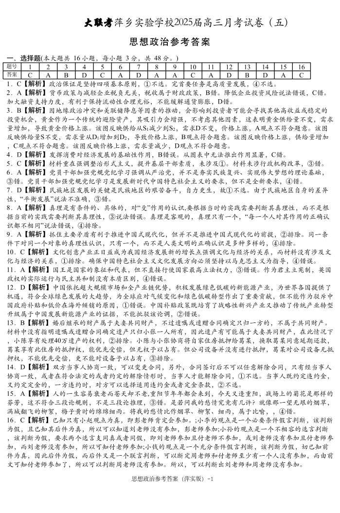 江西省萍乡市萍乡实验2025届高三上学期月考卷(五)政治答案