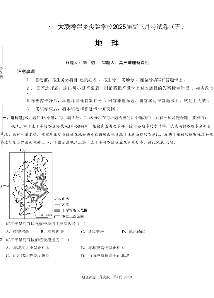 江西省萍乡市萍乡实验2025届高三上学期月考卷(五)地理