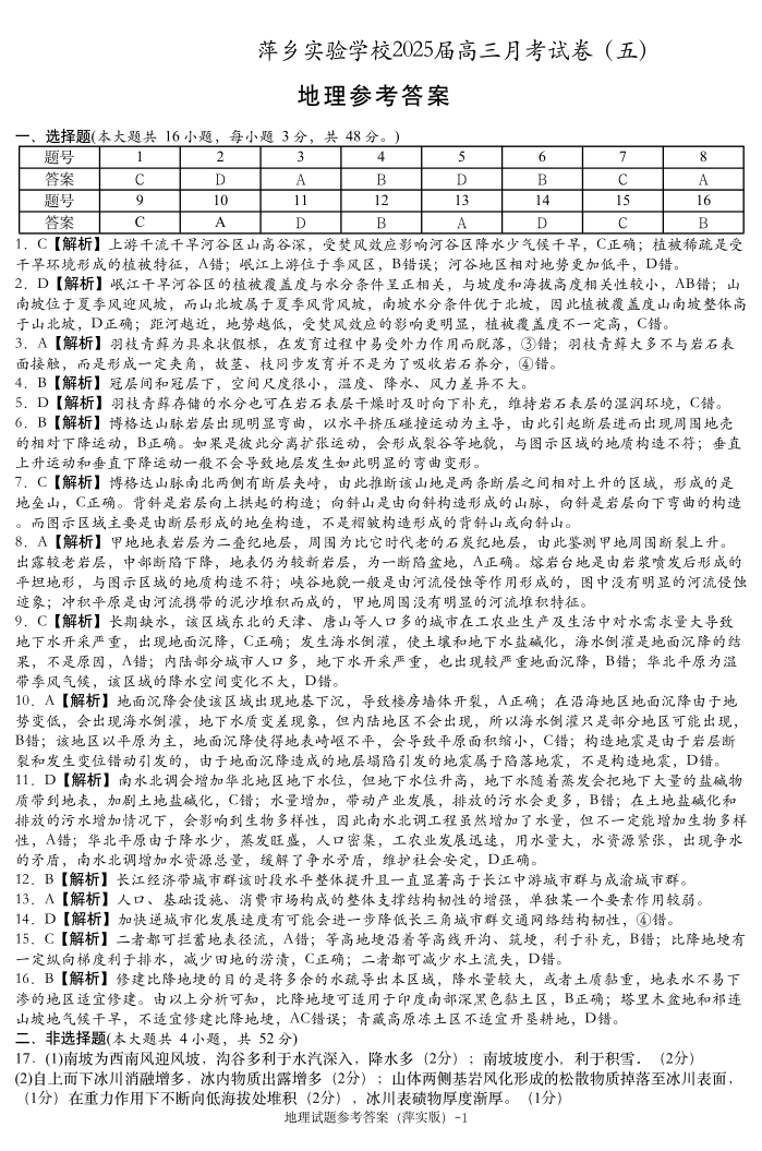 江西省萍乡市萍乡实验2025届高三上学期月考卷(五)地理答案