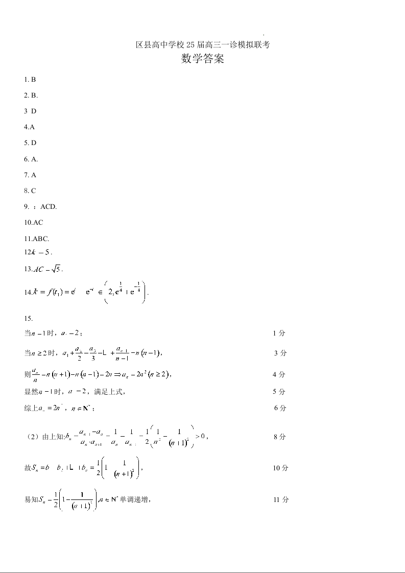 四川省眉山市区县高中2025届高三上学期12月一诊模拟联考数学答案