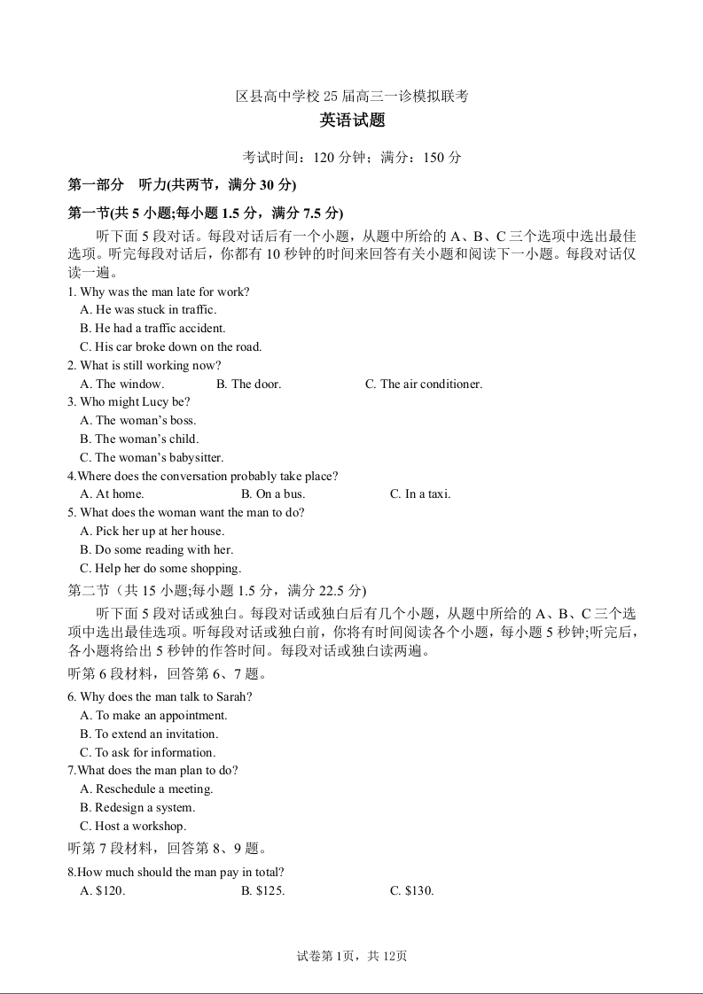 四川省眉山市区县高中2025届高三上学期12月一诊模拟联考英语