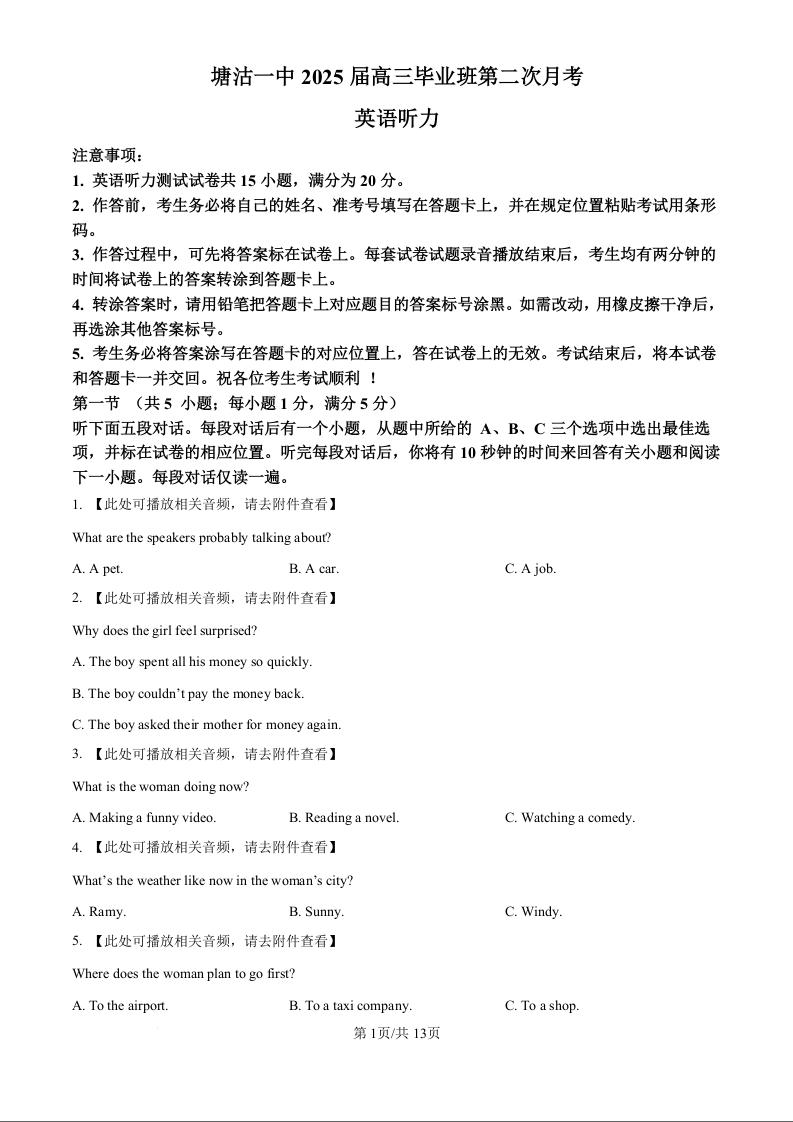 天津市滨海新区塘沽第一中学2025届高三上学期第二次月考英语 (原卷版)
