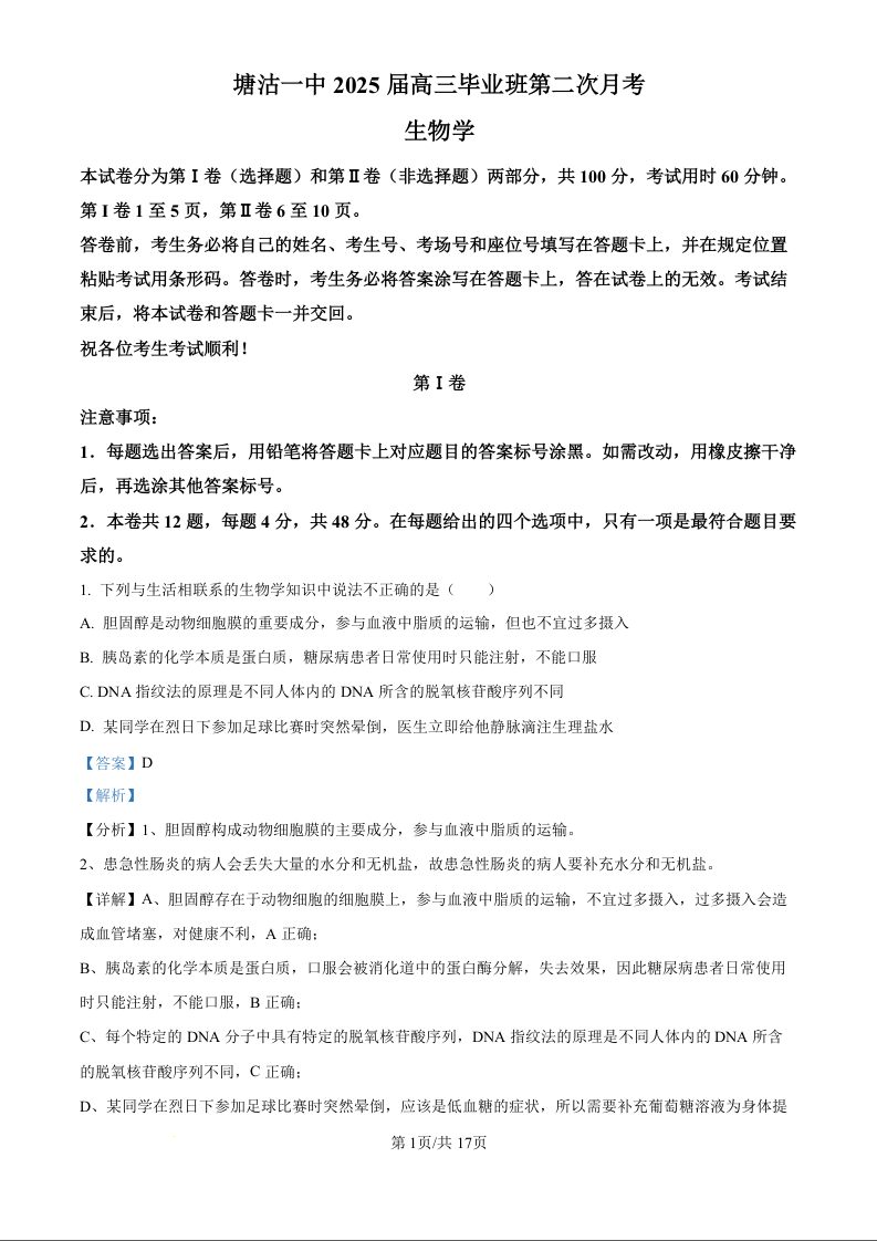天津市滨海新区塘沽第一中学2025届高三上学期第二次月考生物学(精品解析版)