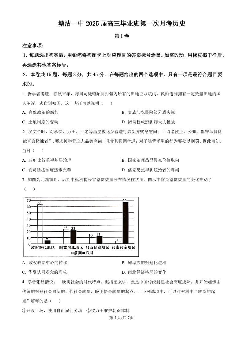 天津市滨海新区塘沽第一中学2025届高三上学期第二次月考历史(原卷版)