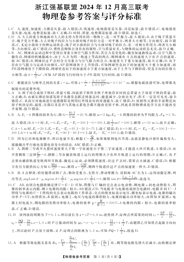 浙江省强基联盟2025届高三上学期12月联考物理答案