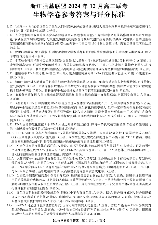 浙江省强基联盟2025届高三上学期12月联考生物答案