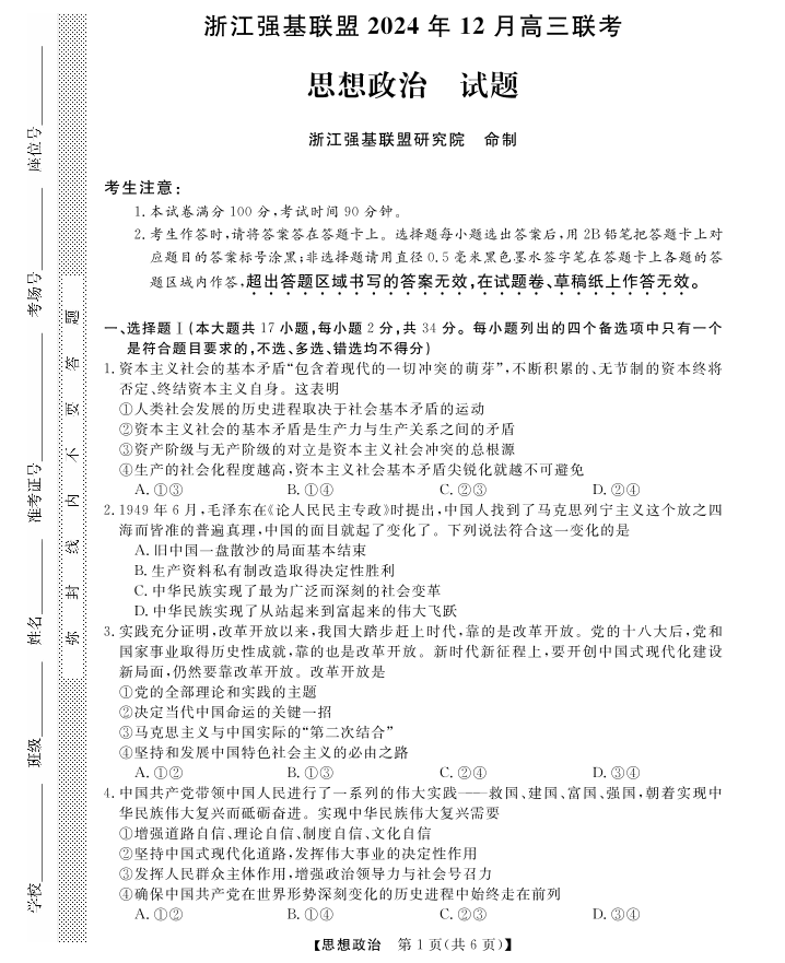 浙江省强基联盟2025届高三上学期12月联考政治