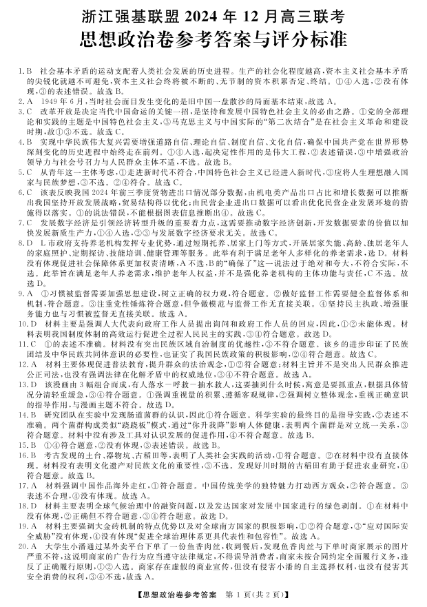 浙江省强基联盟2025届高三上学期12月联考政治答案
