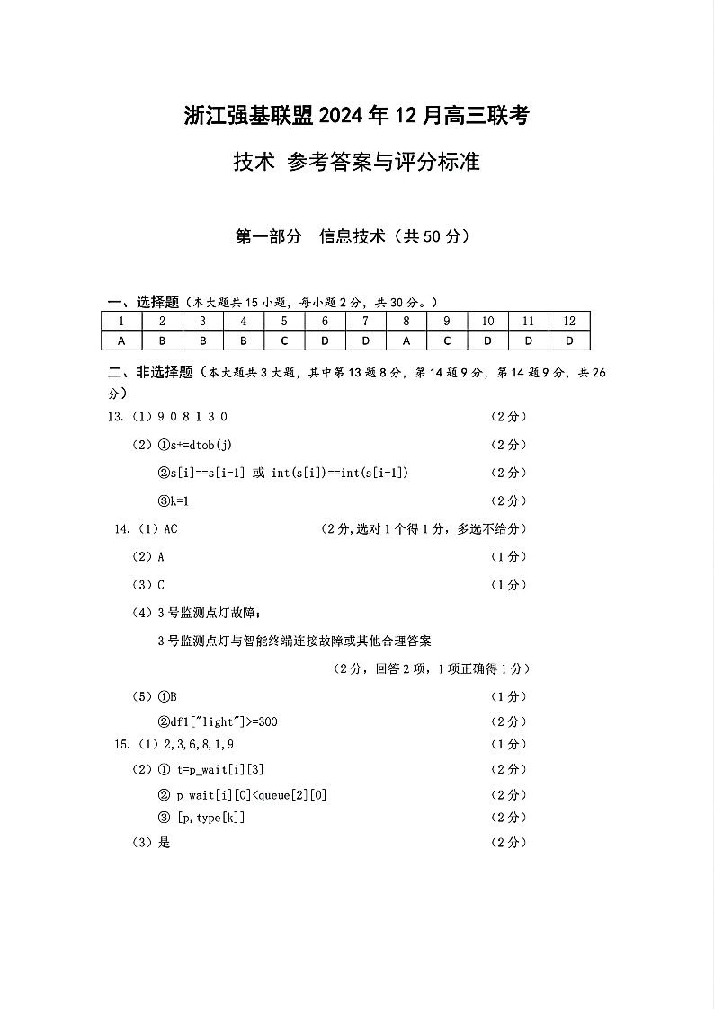 浙江省强基联盟2025届高三上学期12月联考技术答案