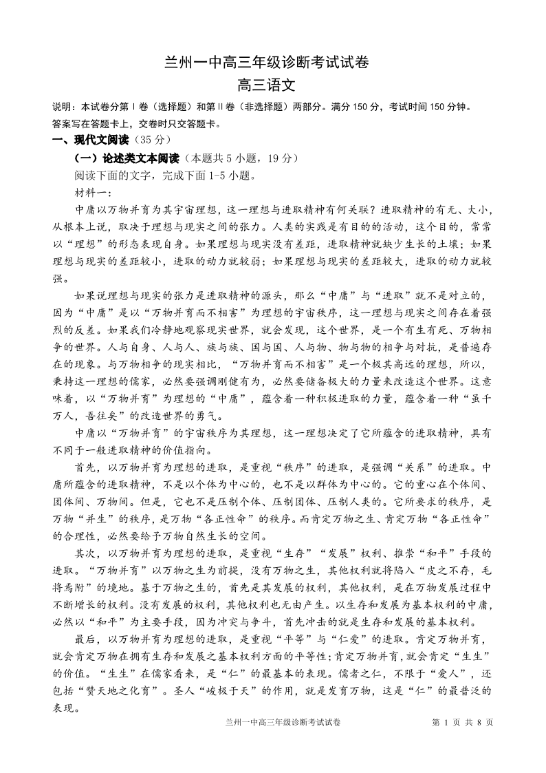 甘肃省兰州第一中学2025届高三年级诊断考试试卷语文+答案