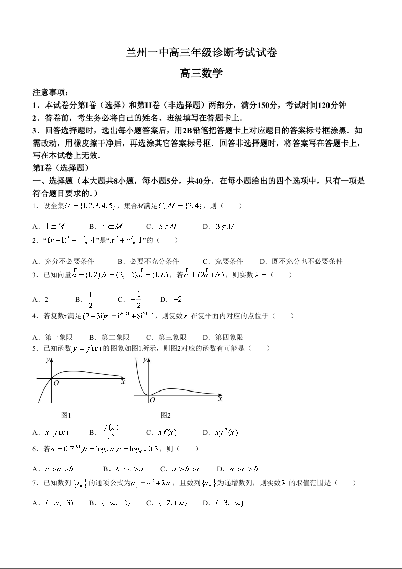 甘肃省兰州第一中学2025届高三年级诊断考试试卷数学+答案