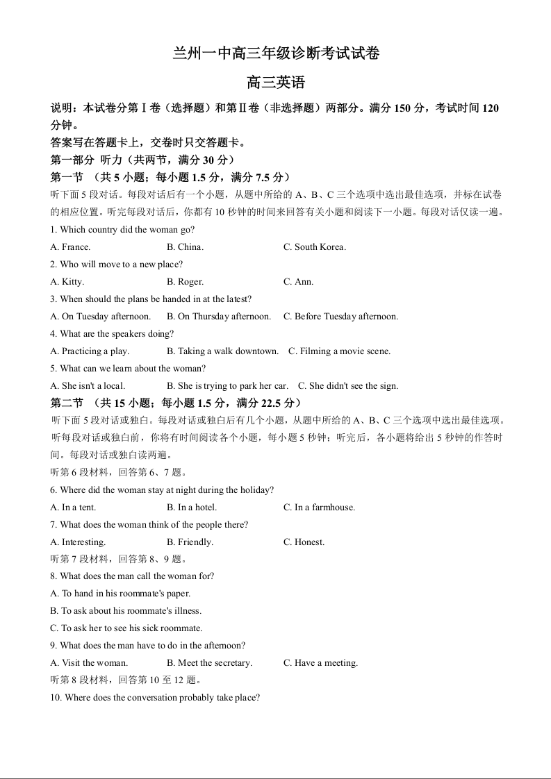 甘肃省兰州第一中学2025届高三年级诊断考试试卷英语+答案