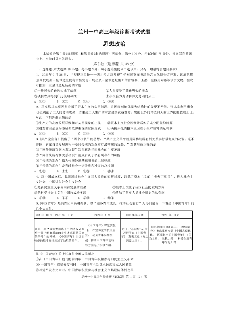 甘肃省兰州第一中学2025届高三年级诊断考试试卷政治+答案
