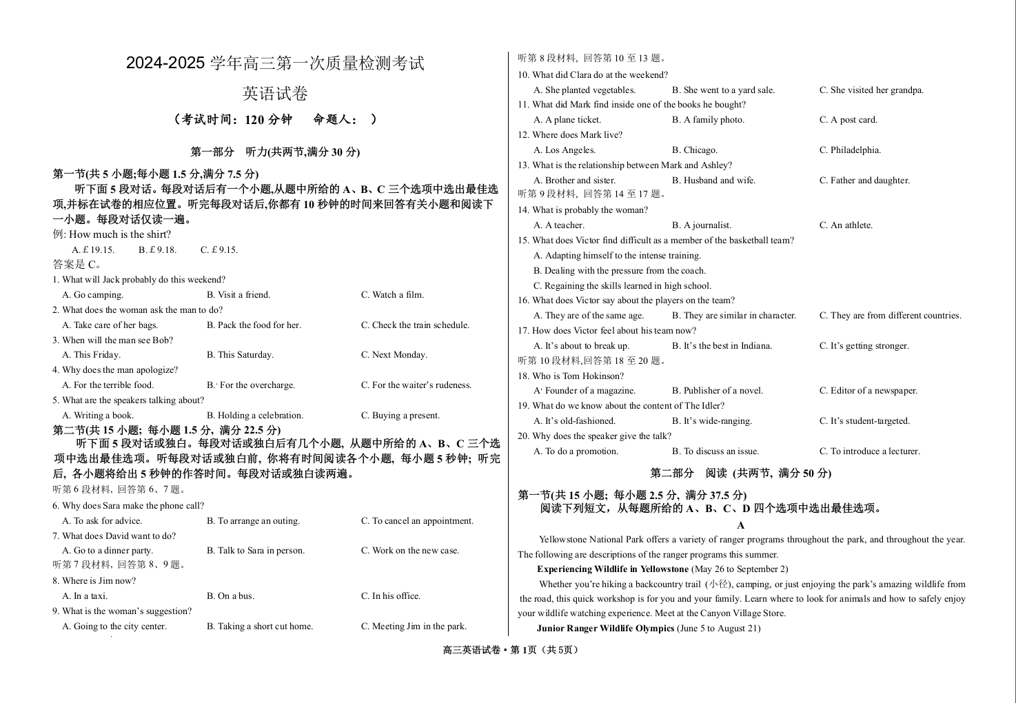甘肃省武威市凉州区2024-2025学年高三第一次质量检测考试英语