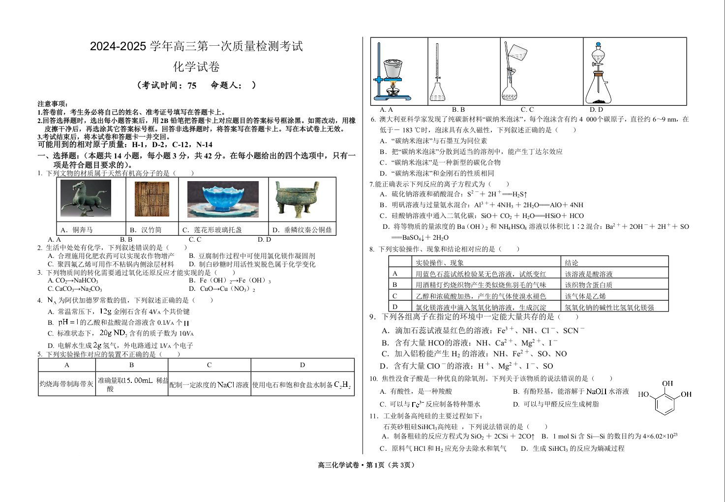甘肃省武威市凉州区2024-2025学年高三第一次质量检测考试化学