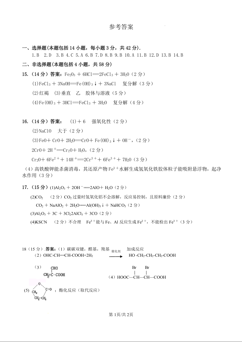 甘肃省武威市凉州区2024-2025学年高三第一次质量检测考试化学答案