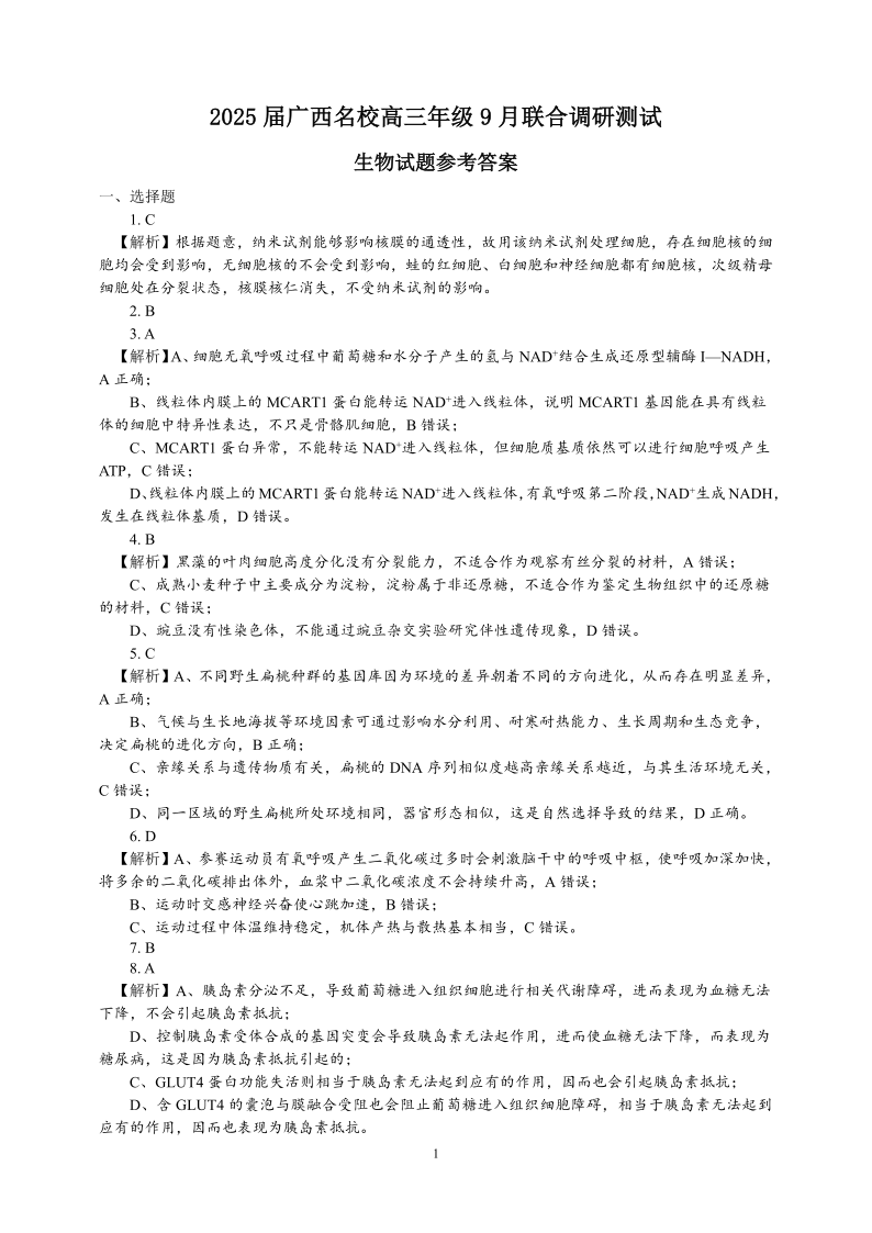 广西名校2025届高三年级9月联合调研测试生物答案