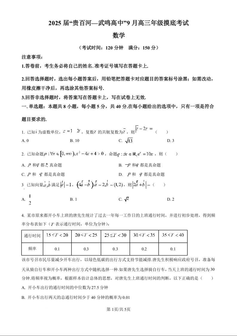 广西省“贵百河—武鸣高中”2025届高三上学期9月摸底考试数学试题(原卷版)