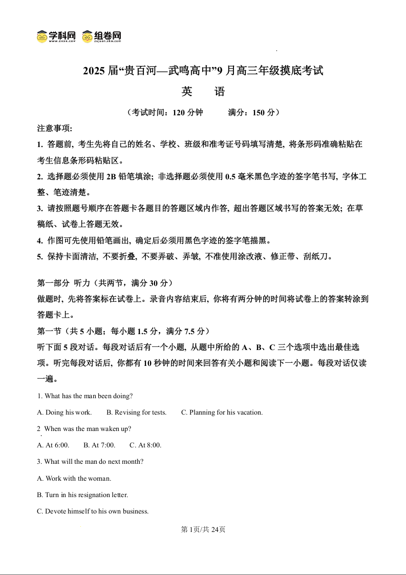 广西省“贵百河—武鸣高中”2025届高三上学期9月摸底考试英语试卷(解析版)