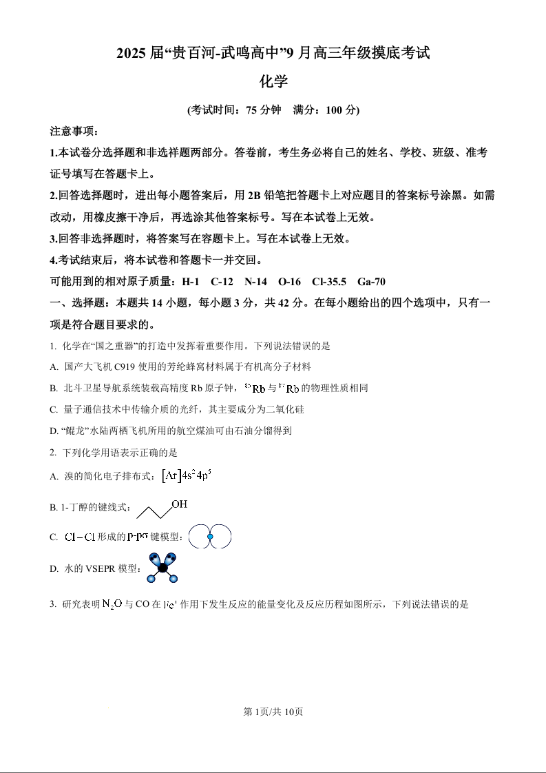 广西省“贵百河—武鸣高中”2025届高三上学期9月摸底考试化学试题(原卷版)