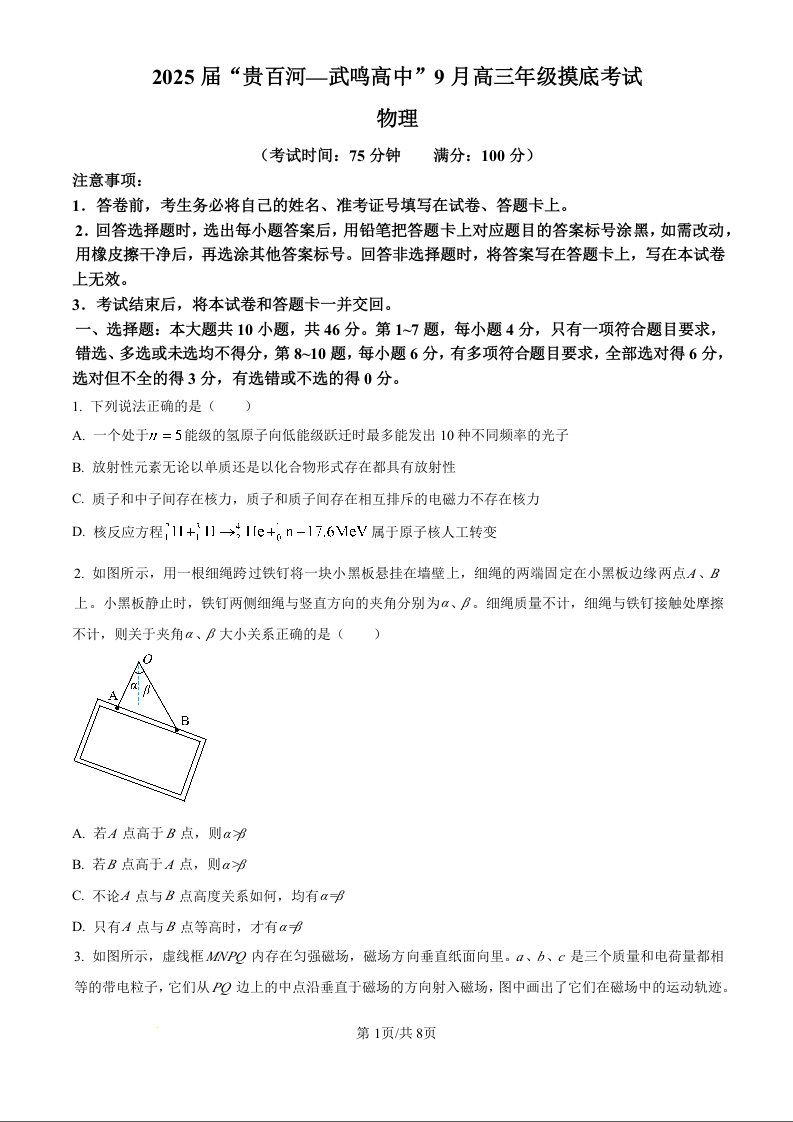 广西省“贵百河—武鸣高中”2025届高三上学期9月摸底考试物理试题(原卷版)