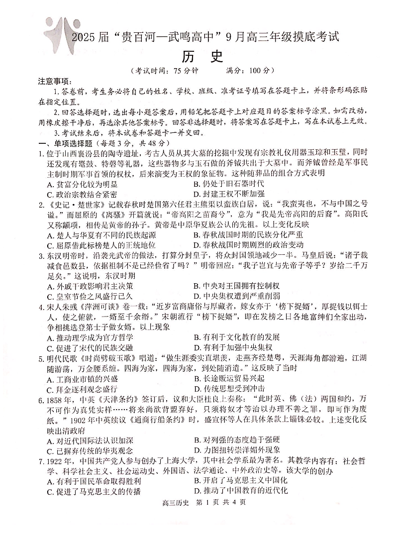 广西省“贵百河—武鸣高中”2025届高三上学期9月摸底考试历史