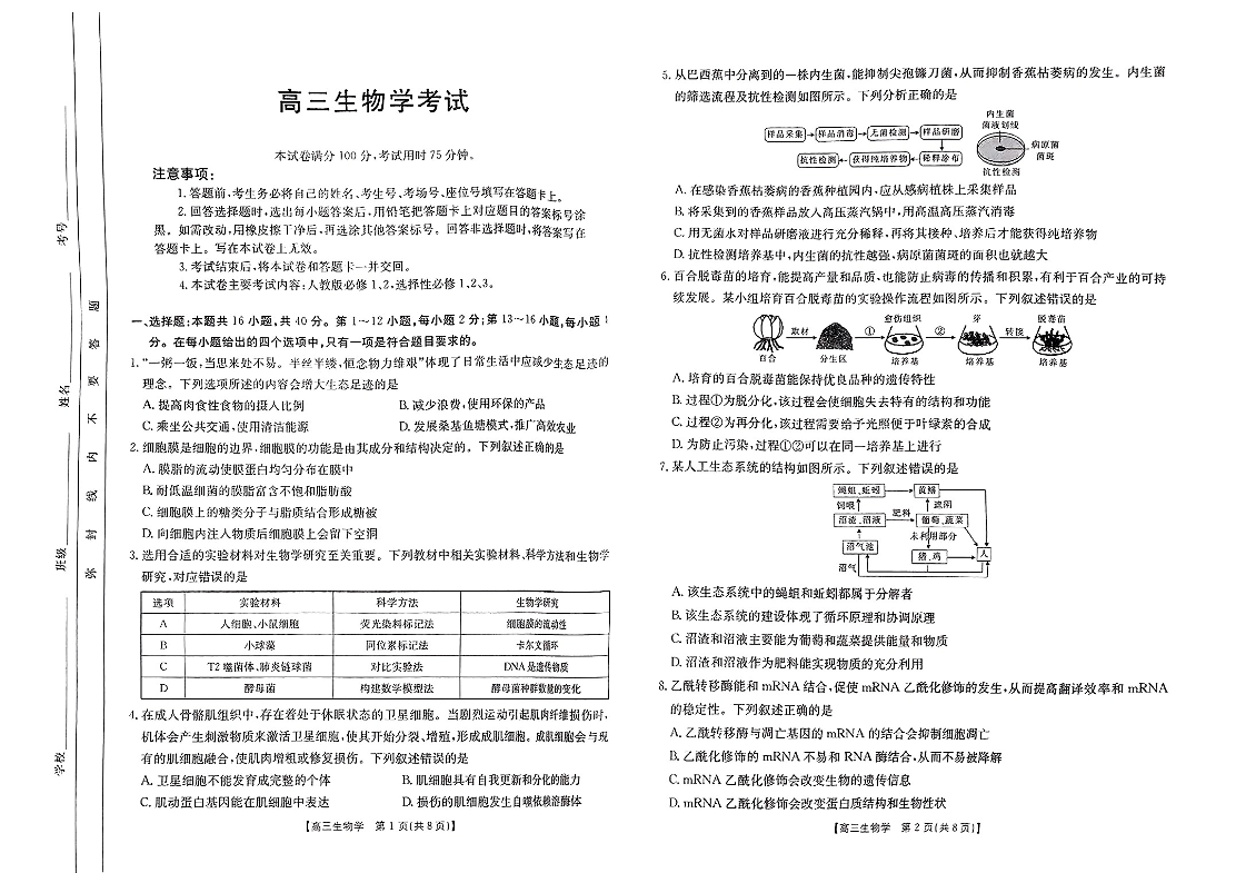 广西省部分高中2025届高三9月联考生物