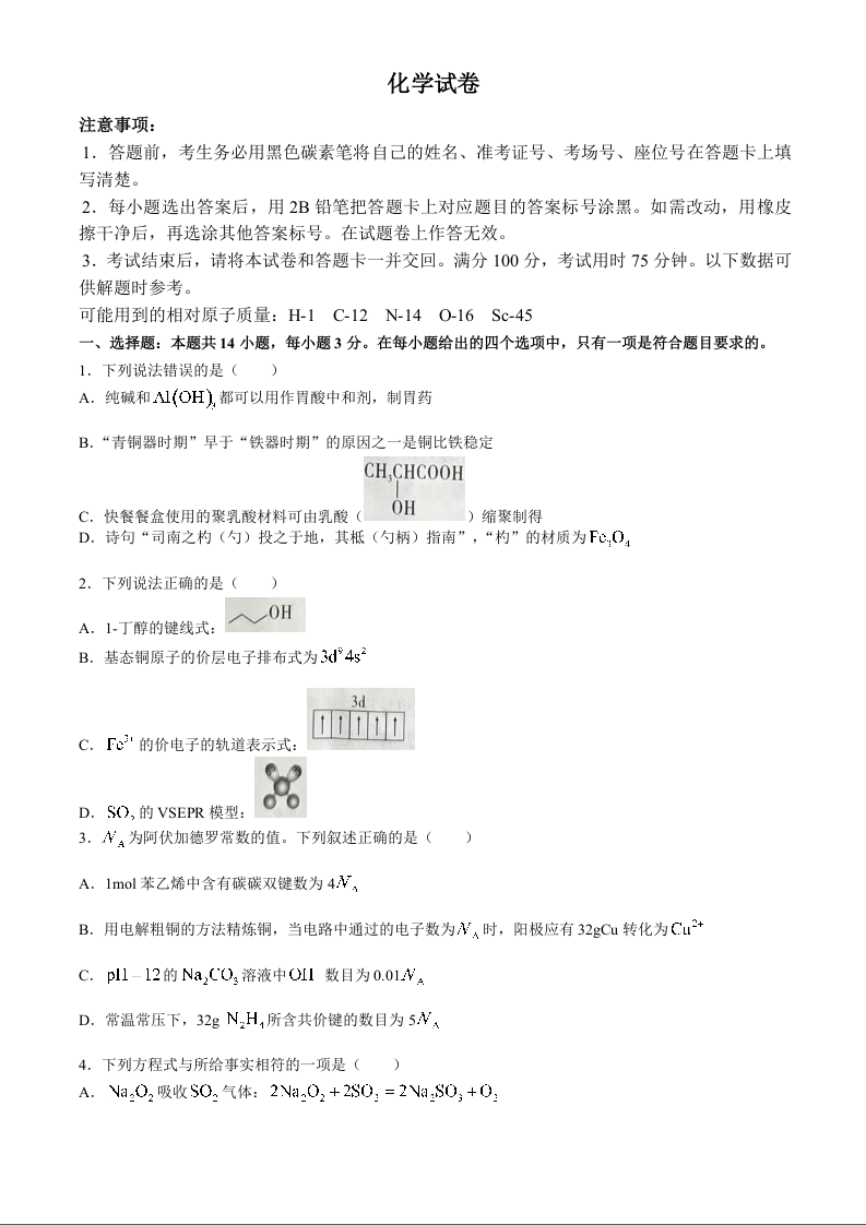 贵州省贵阳市第一中学2025届高三上学期适应性月考(一)化学+答案