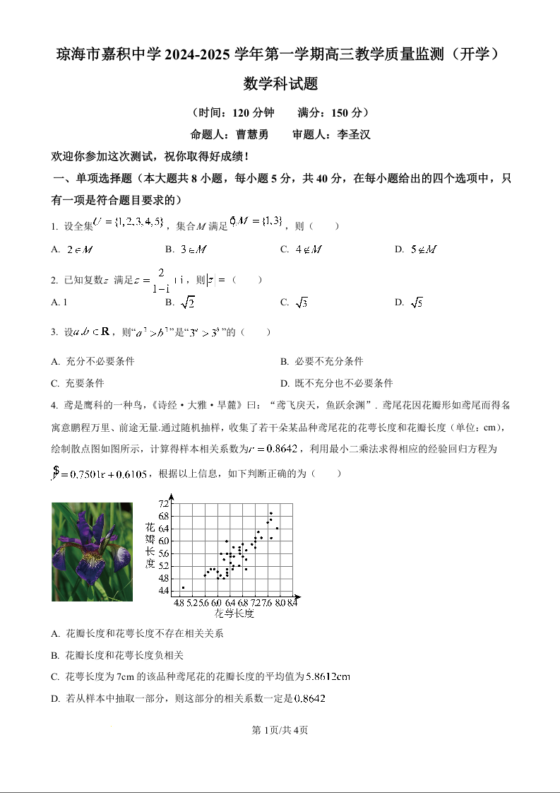 海南省琼海市嘉积中学2024-2025学年第一学期高三教学质量检测数学试题(原卷版)