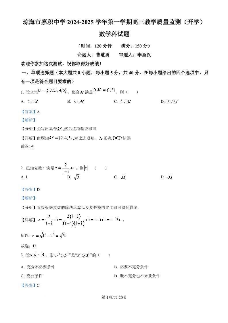 海南省琼海市嘉积中学2024-2025学年第一学期高三教学质量检测数学试题(解析版)